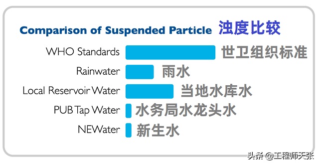 此外,江河和水利樞紐水里帶有較多的是懸浮顆粒和膠體溶液顆粒物,這種顆粒物被地面上的降水沖洗到河水和水利樞紐中。而新生水因?yàn)榛钚蕴窟^(guò)濾,使產(chǎn)生水渾濁度的殘?jiān)w粒物成分大幅度降低,因此NEWater 比 PUB 水更為清亮。