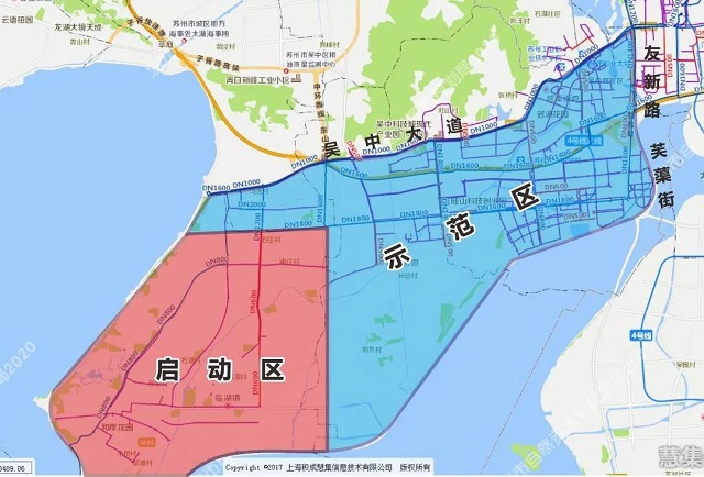 臨湖片區(qū)高品質(zhì)供水啟動區(qū)位于吳中區(qū)西側(cè),毗鄰太湖,北至東太湖路,南至大缺港,東至東山大道,西至環(huán)太湖路,總面積約54平方公里,共包含44個小區(qū),12個行政村,目前服務(wù)人口數(shù)量約為10萬人。該片區(qū)飲用水主要由吳中新水廠供給,供水規(guī)模約2.5萬m3/天。