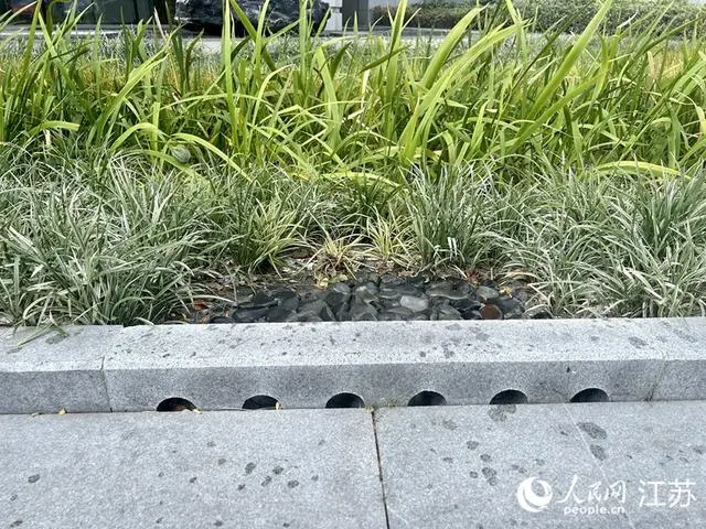一處雨水花園內(nèi),圍住花園的路緣石上,開了6個(gè)圓孔。看似普通的設(shè)計(jì),卻可以使雨水快速導(dǎo)入花園中,這是讓“海綿”吸飽水的第一步。