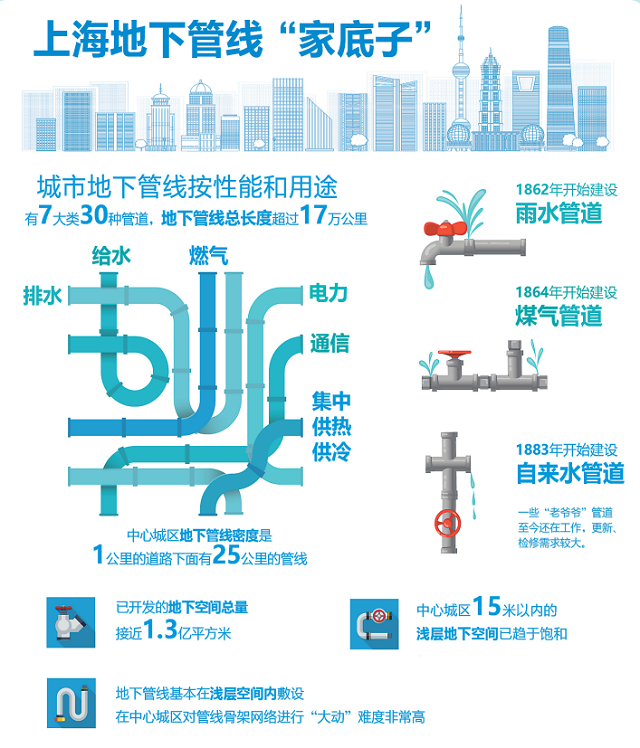 市政管線是城市的生命線。目前上海地下管網(wǎng)按性能和用途已有給水、排水、燃?xì)狻㈦娏Α⑼ㄐ拧⒓泄峁├涞?大類30種管道,地下管線總長(zhǎng)度超過(guò)17萬(wàn)公里。總體而言,上海的地下管線建設(shè)和管理一直處于全國(guó)領(lǐng)先水平。