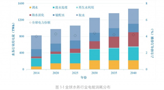 而污水處理不僅是水質(zhì)凈化的過程,也是實(shí)現(xiàn)碳中和的重要組成部分。從能耗強(qiáng)度來看,城鎮(zhèn)水務(wù)一直被冠以能源密集型、高耗能行業(yè)。根據(jù)國(guó)際能源機(jī)構(gòu)/IEA數(shù)據(jù),水務(wù)行業(yè)耗電量(包括了遠(yuǎn)距離調(diào)水和海水淡化)占到全球總耗電量的4%至6%,取水、污水處理和輸配水是耗電量最高的3個(gè)環(huán)節(jié)。