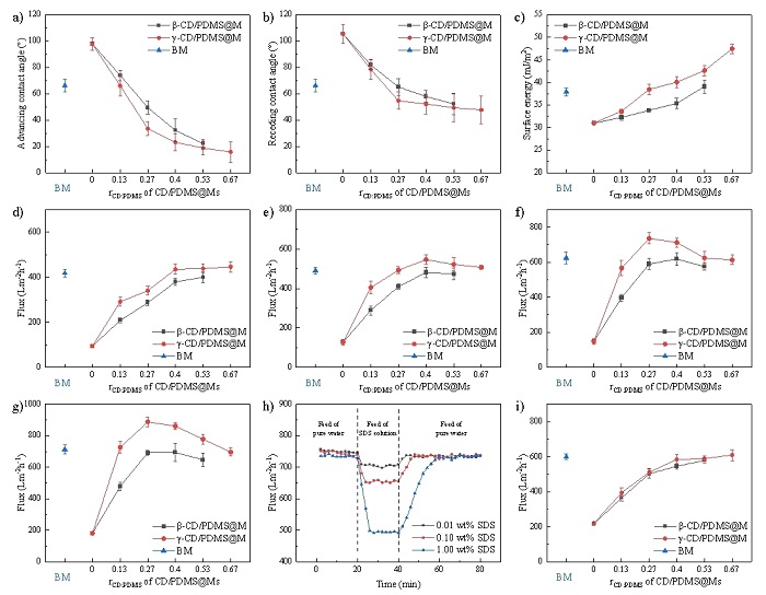 針對上述問題,團隊提出使用超分子而非高分子在水處理膜表面構建抗污染層的策略。超分子為由聚二甲基硅氧烷(PDMS)和環糊精(CD)組成的聚輪烷。PDMS為低表面能線性大分子,CD是親水環狀小分子,CD-PDMS聚輪烷呈線穿環結構。CD可沿PDMS鏈滑動、旋轉和振動,形成相對動態親水-低表面能非均相微區。這一結構可使污染物與膜表面的接觸不穩定,輔以CD的布朗運動,能夠在低切向流,甚至靜態條件下有效驅除膜表面污染物。此外,還可防止低表面能組分團聚,并通過氫鍵作用攜帶并促進水分子傳輸。